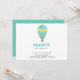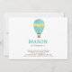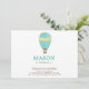 Une invitation d'anniversaire moderne pour l'anniversaire d'un petit garçon avec une montgolfière couleur aquarelle en turquoise et jaune, et texte d'invitation en police marron. Le support de la carte est turquoise. D'autres pièces de ce design sont disponibles.