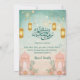 Invite your loved ones to a memorable evening with this magical Iftar invitation. Featuring a dreamy watercolor starry sky in teal, elegant hanging gold lanterns, and soft peach flowers framing traditional Islamic domes. This whimsical and elegant design is perfect for Ramadan gatherings, Eid celebrations, or any special Islamic event. Fully customizable for your personal details.