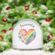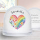 This snow globe features a floral rainbow heart design in a colorful watercolor style, personalized with a name above. Customize with your own message on the back, to make this an individual keepsake gift for someone special.