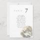 Minimalist and elegant wedding table number seating chart cards featuring a watercolor painting of a seashell. The pairing of the soft watercolor beach scene and the chic typography makes for a beautifully chic combo.
