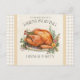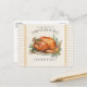 Réunissez vos proches avec cette invitation à la carte postale Friendsgiving. Le design présente une dinde joliment rôtie sur un plateau entouré d'herbes et de baies, encadrée d'une bordure en vichy beige douce de chaque côté. Un lave-linge jaune crème et muet l'arrière - plan, tandis que l'élégant script dit : "Rejoignez-nous pour un dîner d'action d'amitié." Le verso comprend des champs de texte personnalisables pour les détails de votre événement, ce qui facilite la personnalisation de votre réunion. Parfait pour accueillir une fête d'automne chaleureuse et festive.
