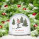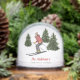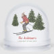 This personalizable keepsake snow globe features Destei's watercolor illustration of a woman skier in a red jacket with green fir trees and a some snow texture over. Personalize the top red text with a family name and the green bottom text with a cabin or location and make a lasting keepsake for ski cabins, winter retreats or your home.