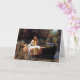John William Waterhouse La carte de voeux de la Dame de Shalott. Peinture à l'huile sur toile de 1888. La Dame de Shalott est une belle peinture pré-raphaélite d’une scène du poème du même nom d’Alfred Lord Tennyson. Le tableau représente la dame de Shalott condamnée naviguant vers Camelot dans un petit bateau drapé d'une belle tapisserie rouge qu'elle a tissée tout en tombant amoureuse de Lancelot. Dans le bateau s'assoient trois bougies et un crucifix d'où la fille regarde loin. La dame elle-même est vêtue d'une robe médiévale bleue claire et fluide, brodée d'or. Elle a les cheveux auburn légers et elle tient la chaîne du bateau pendant qu'il presse loin du quai dans les roseaux et les calottes de nénuphars au-delà. Un grand cadeau pour les fans de John William Waterhouse, les Pré-Raphaélites, la peinture romantique anglaise et la légende arthurienne.