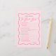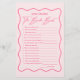 Célébrez avec le jeu "Personnalisé Wavy Pink Fête des mariées Who Knows the Bride Best", parfait pour l'amour est dans les idées de douche nuptiale air et les idées de douche nuptiale de Valentine. Avec son thème de la Saint-Valentin, ce jeu complète toutes les idées de douche nuptiale rose ou de douche nuptiale rose. Idéal pour lier le thème de la douche nuptiale du noeud ou pour lier le thème de la douche nuptiale du noeud, c’est un ajout amusant d’embrasser les fêtes du revoir manquant, l’amour est dans le thème de la douche nuptiale fleurie, ou une jolie fête de bachelorette rose et de bachelorette rose.