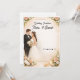 A stunning and sophisticated wedding invitation design featuring a romantic illustration of a bride and groom surrounded by a lush arrangement of white and light pink roses.