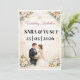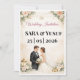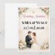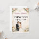 "An elegant and romantic wedding invitation template featuring a beautiful hand-drawn illustration of a bride and groom in a tender embrace. The design is framed with soft blush pink and white roses with green foliage.