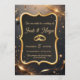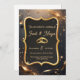 This is a wedding invitation card with an elegant black and gold theme. The main text invites the recipient with the phrase: "You are invited to a wedding of Fadi & Maya." The card features two interlinked gold wedding rings as a central decorative element.