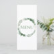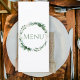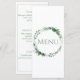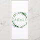 Present your wedding meal with refined simplicity using this elegant greenery wedding menu card. Featuring a soft botanical wreath of eucalyptus and delicate foliage, this design frames your menu header with natural beauty while maintaining a clean, modern layout for your courses. The combination of graceful typography and airy spacing creates a timeless, sophisticated look that enhances any garden, outdoor, or classic wedding setting. Perfect for showcasing starters, main courses, and desserts in an organized and stylish format, this menu card adds a polished finishing touch to your reception tables. Easily customize all menu details to reflect your unique dining experience.