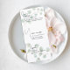 Set the tone for a beautifully curated dining experience with this elegant wedding menu, adorned with soft watercolor greenery and delicate eucalyptus leaves. The design features a graceful flowing script for each course, paired with clean, classic text for the menu details—creating a refined balance of modern simplicity and timeless romance.