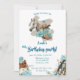 This birthday invitation features a western horse watercolor design with soft floral details and classic cowgirl elements, including cowgirl boots and a cowgirl hat. The white background paired with turquoise and neutral tones creates an elegant western look that’s perfect for a horse birthday party.