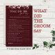 Add laughter and fun to your bridal shower with this elegant What Did the Groom Say game. Featuring a rich burgundy background with soft floral accents, this printable bridal shower game asks guests to guess how the groom answered questions about his bride. Perfect for bridal showers, engagement parties, bachelorette celebrations, and wedding showers. This classy, modern design prints beautifully and coordinates seamlessly with burgundy and floral bridal shower themes. Simply print, play, and enjoy a memorable celebration filled with smiles and friendly competition.