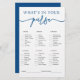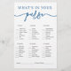 Un jeu de douche nuptiale amusant et interactif qui permet à chacun de fouiller dans ses sacs ! Le jeu imprimable What’s In Your Purse présente sous la forme d’un design moderne "quelque chose de bleu" avec des valeurs numériques hiérarchisées pour maintenir la concurrence vivante. Les clients vérifient les objets qu'ils ont dans leur sac à main et font le décompte de leurs points. Celui qui a le total le plus élevé gagne ! Un complément parfait à votre élégant thème de douche nuptiale bleue.