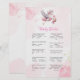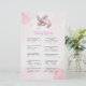 Mettez vos invités au défi avec des faits amusants et surprenants pour bébé dans cette carte de jeu "Baby Trivia", entourée de nuages roses et d'un design de cigogne doux. Les couleurs pastel et les étoiles scintillantes ajoutent un charme doux et féminin tout en gardant le jeu visuellement sur le thème. C’est une façon engageante d’éduquer et de divertir en même temps.