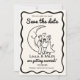 Whimsical and fun Over the Moon wedding save the date invitation card featuring a bride and groom toasting to their happy future.
