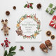 Whimsical Christmas Baby Shower invitation featuring adorable woodland animals, including a sweet deer, cuddly bear, and playful penguin, arranged in a festive wreath. The design is accented with soft pine branches, holly, dried oranges, and red berries, creating a cozy winter atmosphere. Perfect for celebrating a winter baby shower, this charming illustration blends gentle holiday magic, woodland warmth, and a joyful, family-friendly spirit with a touch of rustic elegance.