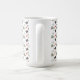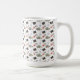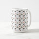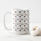 White ceramic mug featuring a playful pattern of postal stamps and envelopes in red, black, and gray, conveying a theme of communication and nostalgia.