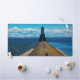 A long breakwater stretches across the water toward a distant lighthouse, drawing the eye along its weathered surface. The contrast between textured concrete, open water, and sky creates a strong sense of direction and depth.