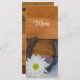 Le charmant menu blanc Mariage blanc de la marguerite et du fer à cheval Country Western peut être personnalisé avec les détails du repas que vous pourrez servir à votre déjeuner de douche nuptiale de style rural informel mais élégant, brunch post-mariage ou dîner de réception de mariage en ajoutant la salade ou le premier plat, entrée ou deuxième plat et dessert ou troisième plat. Ce menu de mariage à thème équin, décontracté et rustique, propose une photographie florale d'une fleur de marguerite blanche, un fer à cheval rouillé, un collier de perle et un voile de mariée blanc avec un arrière - plan de grange patiné marron.