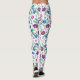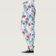 White leggings with vibrant floral patterns, featuring purple, blue, and green flowers and leaves. Worn with black sneakers, conveying a lively, colorful tone.