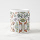 White mug featuring a vibrant jungle animal pattern, including elephants, giraffes, zebras, and lions, surrounded by green leaves on a marble surface.