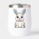 Vector illustration of a smiling white bunny with large, sweet eyes, long, blue ears, and a pink nose, in a cartoon style, on a black background. Suitable as a logo or mascot.