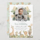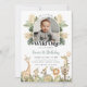 Une invitation de premier anniversaire à thème sauvage qui présente des graphismes animaux safari, espace pour une photo et une police moderne. Cette invitation design est parfaite pour une fête d'anniversaire à thème animal pour un petit garçon. Associez-vous à tout ce qui se trouve dans la collection OSCAR pour un look cohésif.