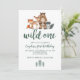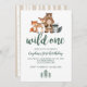 Un sauvage ! Anniversaire des animaux des bois avec ours, renard, cerf, raton laveur et arbres à grains de bois.