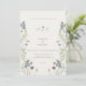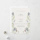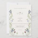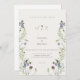 This sophisticated wedding invitation features watercolor wildflowers and botanticals arranged in an organic frame. A traditional floral invitation with a modern, boho twist. Muted blues, purples, pinks and greens give a gentle and elegant palette, while stylised monograms represent the future newlyweds.