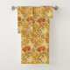Serviette dans un vintage William Morris, Art Nouveau, imprimé floral de chrysanthèmes stylisés, numériquement rehaussé et coloré, dans les tons d'or moutarde, marron caramel, et cuivre, sur un arrière - plan crème
