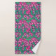 Serviette sertie dans un William Morris, Art Nouveau, imprimé textile d'iris et de feuilles, numériquement rehaussée et colorée, en fuchsia et rose glace, vert paon et blanc, sur un vin profond violet arrière - plan