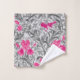Serviette posée dans un William Morris, Art Nouveau, impression textile d'iris et de feuilles, numériquement rehaussée et colorée, en fuchsia et rose pâle, avec des feuilles graphite et gris moyen/gris, sur un arrière - plan gris argenté clair