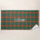 Élégante serviette de plage faite dans le classique clan écossais orange et vert Wilson tartan plaid motif. Personnalisez le grand texte blanc, au milieu, pour répondre à vos besoins.