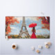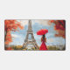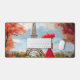 Une femme gracieuse avec un parapluie rouge se promène vers la Tour Eiffel dans une douce brise automnale. Charme parisien romantique dans les tons rouge et or.