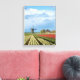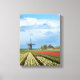 Impression paysage de toile verticale avec un moulin à vent et tulipes jaunes et rouges sous un ciel nuageux dans la campagne néerlandaise sur une belle journée printanière dans la région de Bulb, la Pays-Bas.