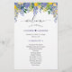 Un programme de mariage floral facile à customiser conception feuille de papier avec eau couleur bleu violet glycine et fleurs jaunes et un grand "accueil" dans un script élégant, un beau programme de mariage pour vous de personnaliser. Pour plus de personnalisation, cliquez sur le lien "customiser plus" et utilisez notre outil de conception pour modifier ce modèle. Consultez la collection correspondante ci-dessous ou cliquez sur le lien : https://www.zazzle.com/collections/wisteria_whispering_love-119995251004136537