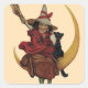 A vintage image of a witch with her broom and black cat sitting on a crescent moon.