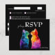 The front of the RSVP postcard features a designated address section, ready to be mailed with ease. The right side beautifully showcases the stunning watercolor artwork of two rainbow-colored cats sitting face-to-face, their gentle gazes creating a tender symbol of connection and love. The vivid rainbow palette reflects the LGBTQ+ pride flag, making this design a bold celebration of love in all its forms. Set against a sleek black background, the artwork becomes an unforgettable focal point, equal parts stylish and meaningful.