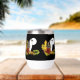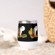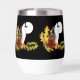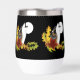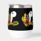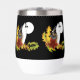 Un loup hurle à la pleine lune avec des feuilles et des glands d'automne sur fond de noir