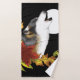 Un loup hurle à la pleine lune avec des feuilles et des glands d'automne dans un arrière-plan noir
