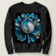 An abstract flower design composed of a large round pearl surrounded by blue and white petals covers this sweatshirt.
