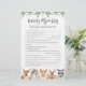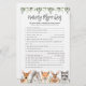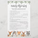 La carte de jeu "quiz" pour la pépinière à thème pour animaux de bois comprend une illustration d'animaux de bois d'aquarelle et de la verdure d'aquarelle, guirlande à eucalyptus et une police élégante manuscrite.