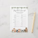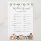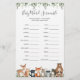 La carte de jeu de mots de baby shower à thème pour les animaux de bois comporte une aquarelle pour les animaux de bois illustration et aquarelle pour la végétation eucalyptus garland et élégante police de style manuscrit.