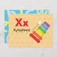 Lettre X est pour Xylophone dans notre ensemble Alphabet Flash Card. Obtenez les 26 lettres de l'alphabet ! Une carte postale recto verso qui est idéale pour les jeux de mémoire et l'enseignement, destinée à l'éducation, les écoles, les enseignants et l'école d'accueil pour la maternelle et les bébés. Tout le texte est modifiable si vous devez customiser.