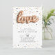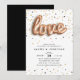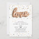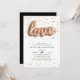 Les invitations uniques à la fête de fiançailles sont accompagnées de "LOVE", épelées dans un script de ballon en or rose, sur un arrière - plan d'or rose, d'or et de confettis noirs. Personnalisez avec vos détails de fiançailles en lettres noires modernes. Les invitations se retournent vers le noir solide.