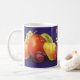 Un étiquette publicitaire vintage de la vallée de Yakima à Washington. Cravate-It-On Fruits étiquette avec le chien sautant est réutilisé sur une tasse.