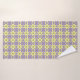 Towels with a geometric floral pattern in yellow and purple are displayed. The top image shows them hanging; the bottom shows a folded washcloth.