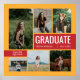 Stylish graduation design features six senior photos with "GRADUATE" as a large focal point. Personalize the modern custom text with your grad's name, school, and class year. Customize the colors of the picture frame and boxes on the front and the boxes on the back to match your school colors or coordinate with the photography. Available in the most popular and common school color combinations - green/yellow, red/yellow, crimson/gold, blue/yellow, navy/gold, black/gold, purple/yellow, red/silver and red/black. Matching products and other colors available.