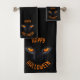 Serviette de bain Enchanted Eyes & Whispers Ensemble de serviettes de bain Halloween Hauntingly élégant ensemble avec un regard félin mystérieux qui éclaire avec le feu d'automne. Dans un décor noir et ombragé, ce design évoque une atmosphère enchanteresse et un charme étrange.