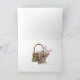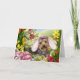 Cartes de Pâques de Yorkie avec adorable chiot Yorkshire Terrier portant les Oreilles de Bunny de Pâques, entouré d'un jardin de fleurs colorées et d'oeufs de Pâques.