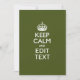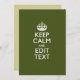 Votre personnalisation Keep Calm vous dit sur une belle décoration personnalisée couleur vert olive. Un style personnalisé Keep Calm en disant sur un cadeau de nature. Essayez humour ou fantaisie sur vos mots créatifs sur deux lignes de texte modifiables. N'oubliez pas d'utiliser les lettres CAPITAL pour obtenir les meilleurs résultats. Utilisez le lien "Demandez à ce concepteur" pour nous contacter pour vos demandes spéciales de design ou pour obtenir de l'aide pour votre projet de personnalisation.
